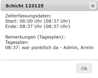 zeigt die Zeiterfassungsdaten und Kommentare an.